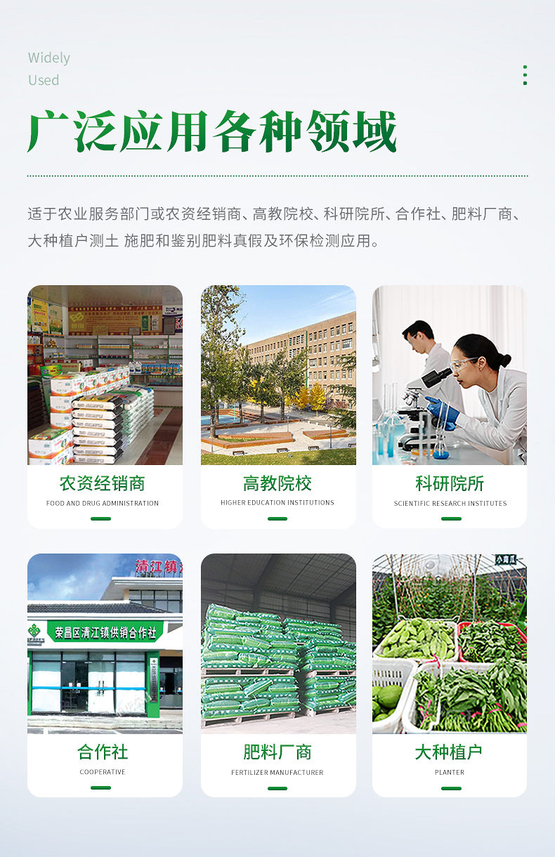 配套齊全:該儀器集藥、器、儀為一體,攜帶方便,相當于一個小型移動實驗室,無需用戶自配附件,亦可靈活野外流動測試。適于農業服務部門或農資經銷商、高教院校、科研院所、合作社、肥料廠商、大種植戶測土施肥和鑒別肥料真假及環保檢測應用。