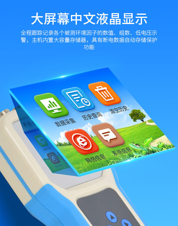 大屏幕中文液晶顯示,全程跟蹤記錄各個被測環境因子的數值、組數、低電壓示警,主機內置大容量存儲器,可儲存三十萬條數據,具有斷電數據自動存儲保護功能。