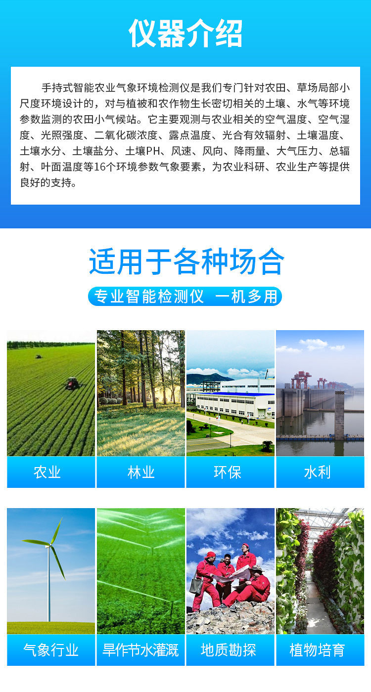廣泛應用于農業、林業、環保、水利、氣象行業、旱作節水灌溉、地質勘探、植物培育等領域。