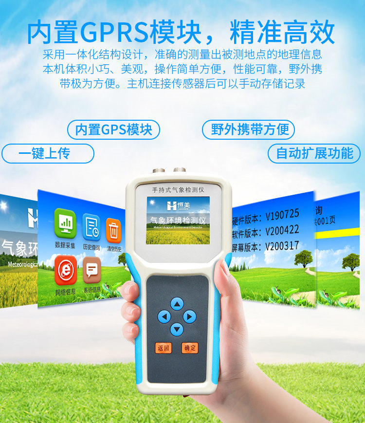 采用一體化結構設計,內置GPS模塊,GPRS模塊,外置SD卡,能準確的測量出被測地點的地理信息,界面除顯示所測環境參數、存儲數據外,還可顯示測點的經緯度。通過內置的GPRS一鍵上傳被測點的環境因子測量數據等。同時還可以通過外置SD卡直接把數據導出到電腦上。(可選)