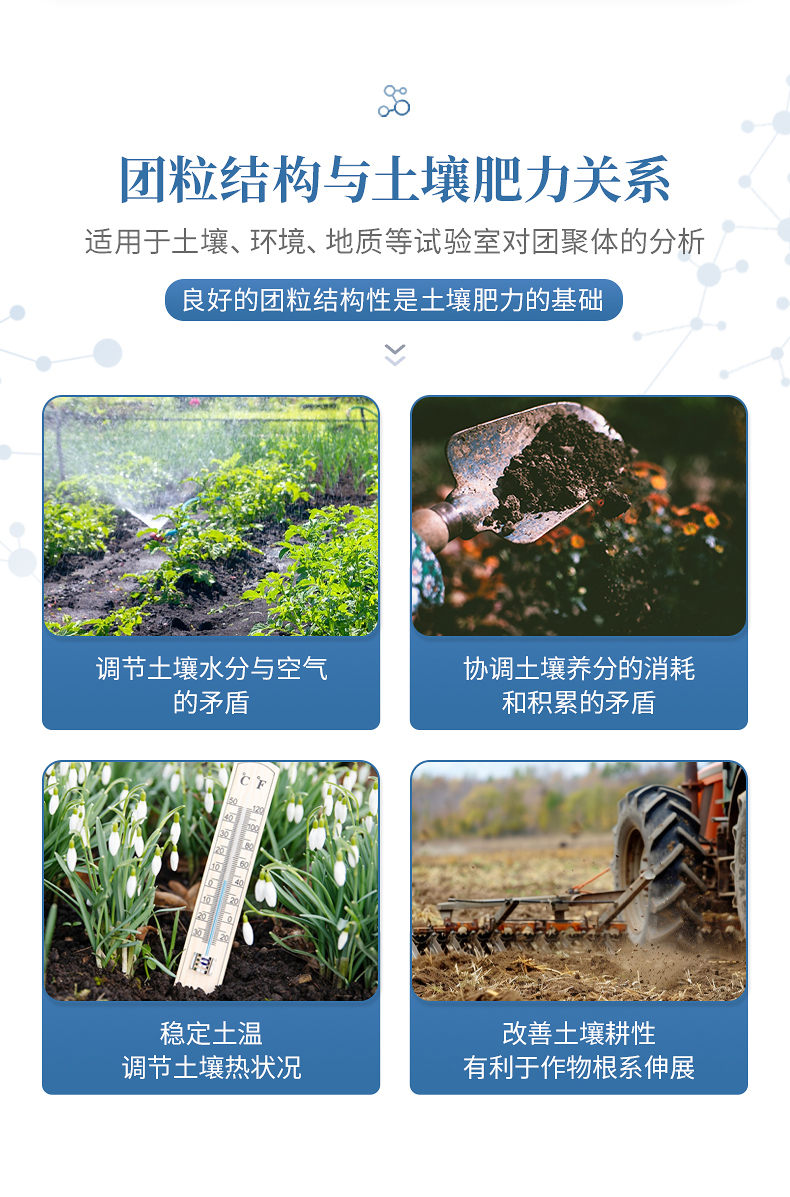 1、土壤團粒結構對土壤肥力起著重要作用。良好的團粒結構體一般應具備三方面的性質:具有一定的大小,過大或過小都對形成適當的孔隙比例不利;具有多級孔隙,大孔隙可通氣透水,小孔隙保水保肥;具有一定的穩(wěn)定性,即水穩(wěn)性、機械穩(wěn)性和生物學穩(wěn)定性。良好的團粒結構性是土壤肥力的基礎,團粒結構與土壤肥力的關系主要表現在以下幾個方面:調節(jié)土壤水分與空氣的矛盾;協(xié)調土壤養(yǎng)分的消耗和積累的矛盾;穩(wěn)定土溫,調節(jié)土壤熱狀況;改善土壤耕性,有利于作物根系伸展。土壤團粒分析儀適用于土壤、環(huán)境、地質等試驗室對團聚體的分析。